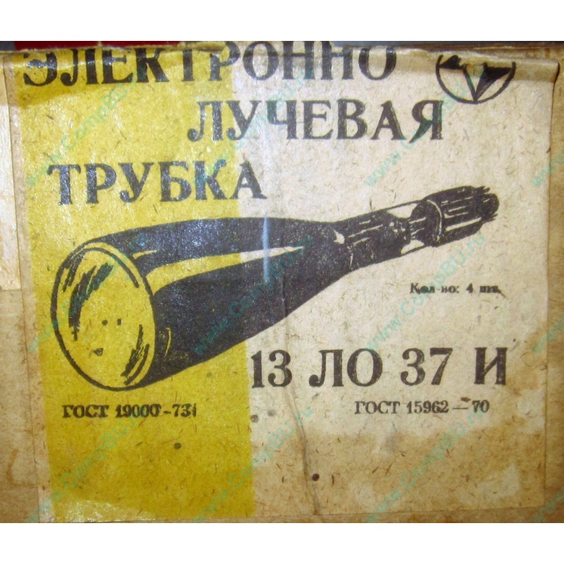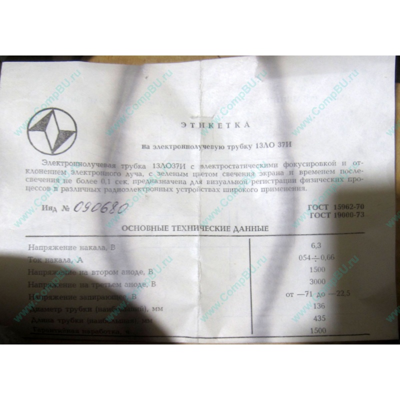 Осциллографическая электронно-лучевая трубка 13ЛО37И. Для визуального наблюдения электрических процессов. Цвет свечения экрана 13ЛО37И -зеленый. Короткое время послесвечения. Диаметр 136 мм, длина 435 мм.