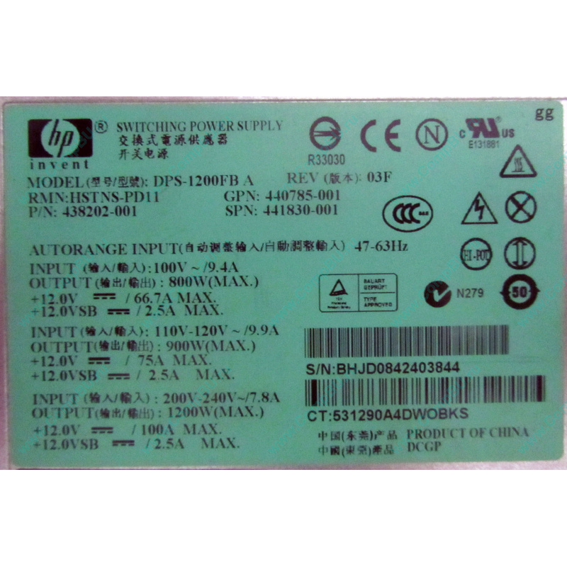Б/У серверный блок питания 1200W HP DPS-1200FB A HSTNS-PD11 Rev: 03F (SPN 441830-001, P/N 438202-001, GPN 440785-001) для серверов HP DL165, DL360 / DL380 G6/G7, DL370 G6, DL580 G7.